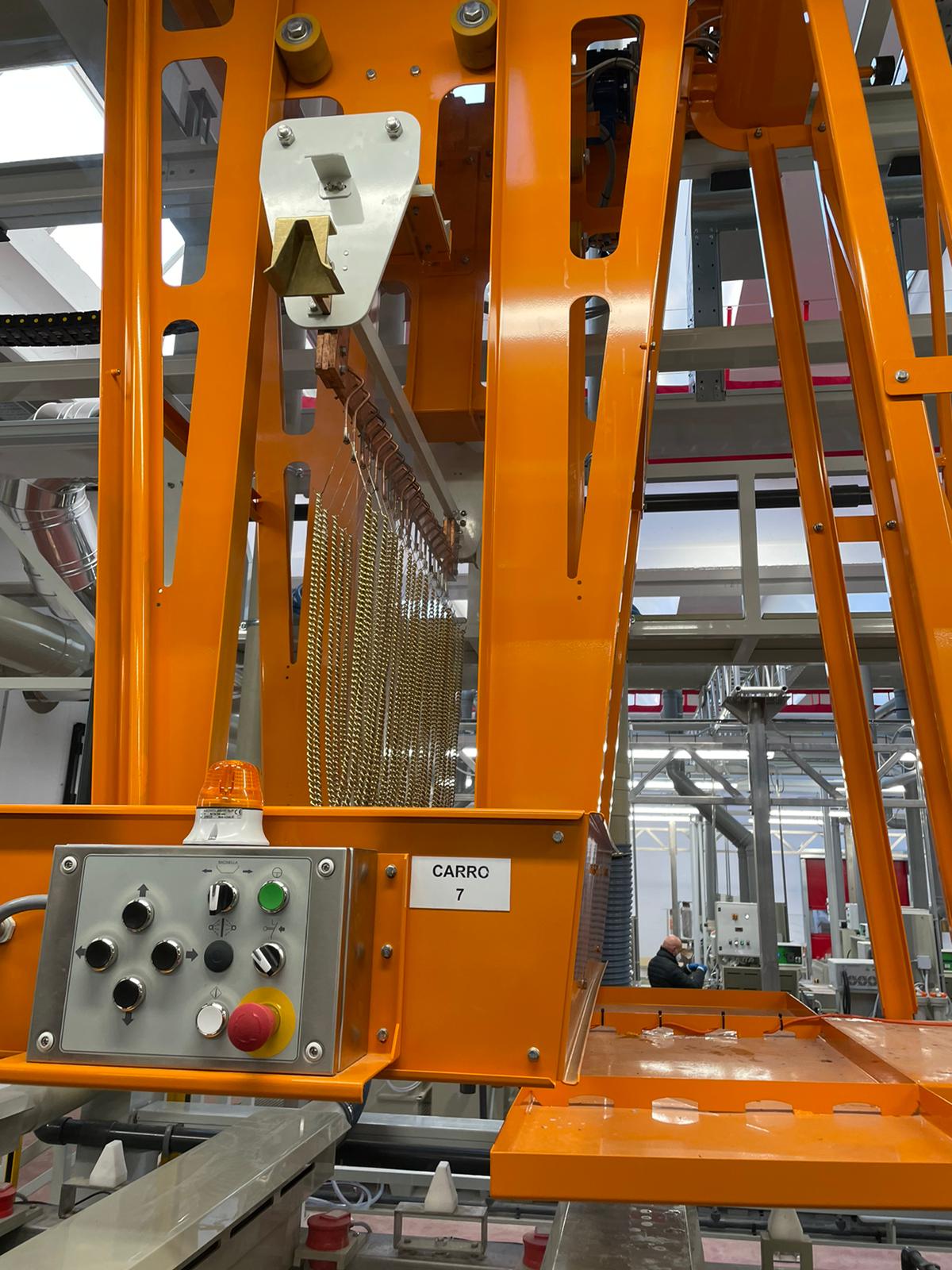 Example of an automatic plant for the production of metal accessories for leather goods, developed on 3 lines of 30 metres each with 9 conveyor carts Productivity: 1 piece-holder bar every 4 minutes